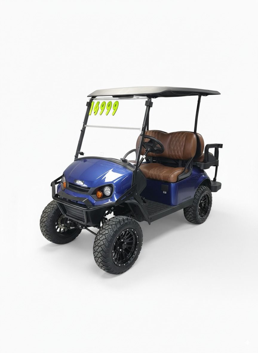 this is a metallic blue gas cart with lifted suspension and diamond stiched brown seats